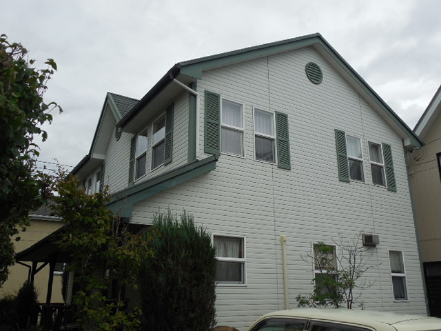 北欧風のデザイン住宅。現場調査にて屋根のスレート瓦は塗装が不可能との診断で、カバー工法により新たに被せました。 外壁はサイディングのひび割れやコーキング部の劣化にも追従できるよう伸縮性、遮熱効果に優れたアステックペイントのEC-2000F-IRを使用しました。 S様邸ではトイレも不具合な箇所があり、合わせてリフォームしました。 外壁のカラーはブロークンホワイトと、コーナー部やガラリ戸に(イギリス人が好んで住宅に用いた緑色)ミッドブランズウィックグリーンを使用。 周囲の木々がマッチした北欧の風を感じる外観になりました。