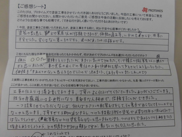 I様:塗装の良し悪し、どの業者さんが信頼できるか、価格の適正等、いずれもわからず、非常に不安でした。安くはない買い物ですし迷いがあったのは確かです。
