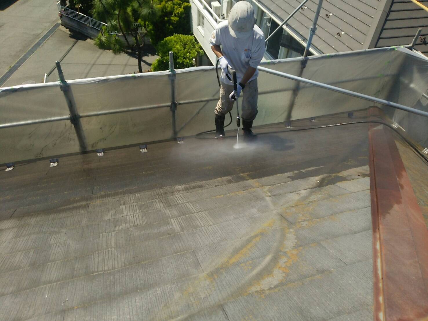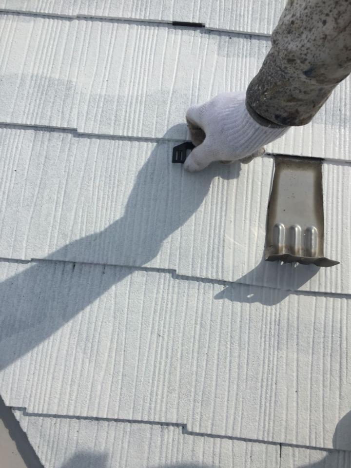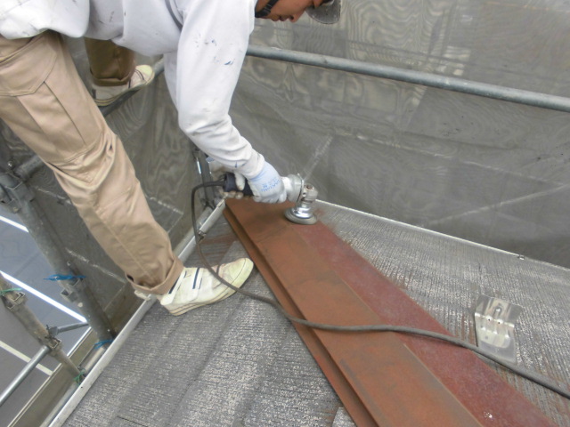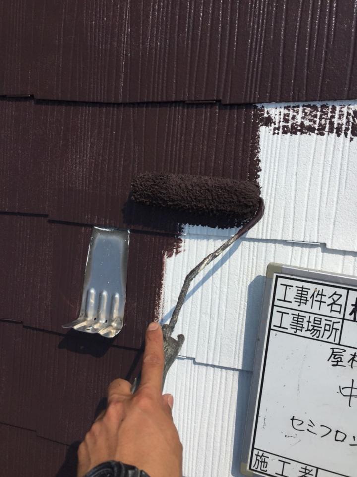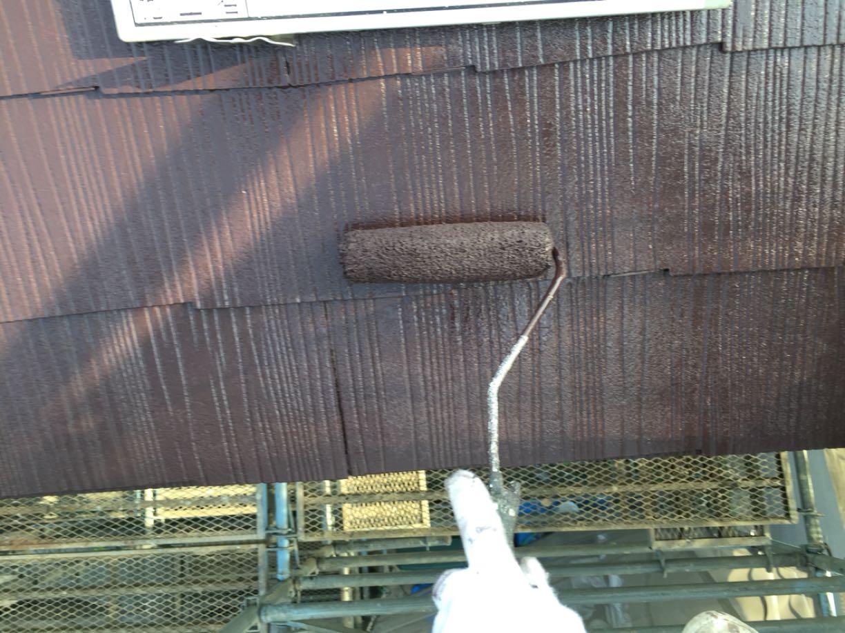 屋根の下地処理として防かび材を塗布後、塗装。棟板金に関しては防さび材を下塗りに使用しました。
