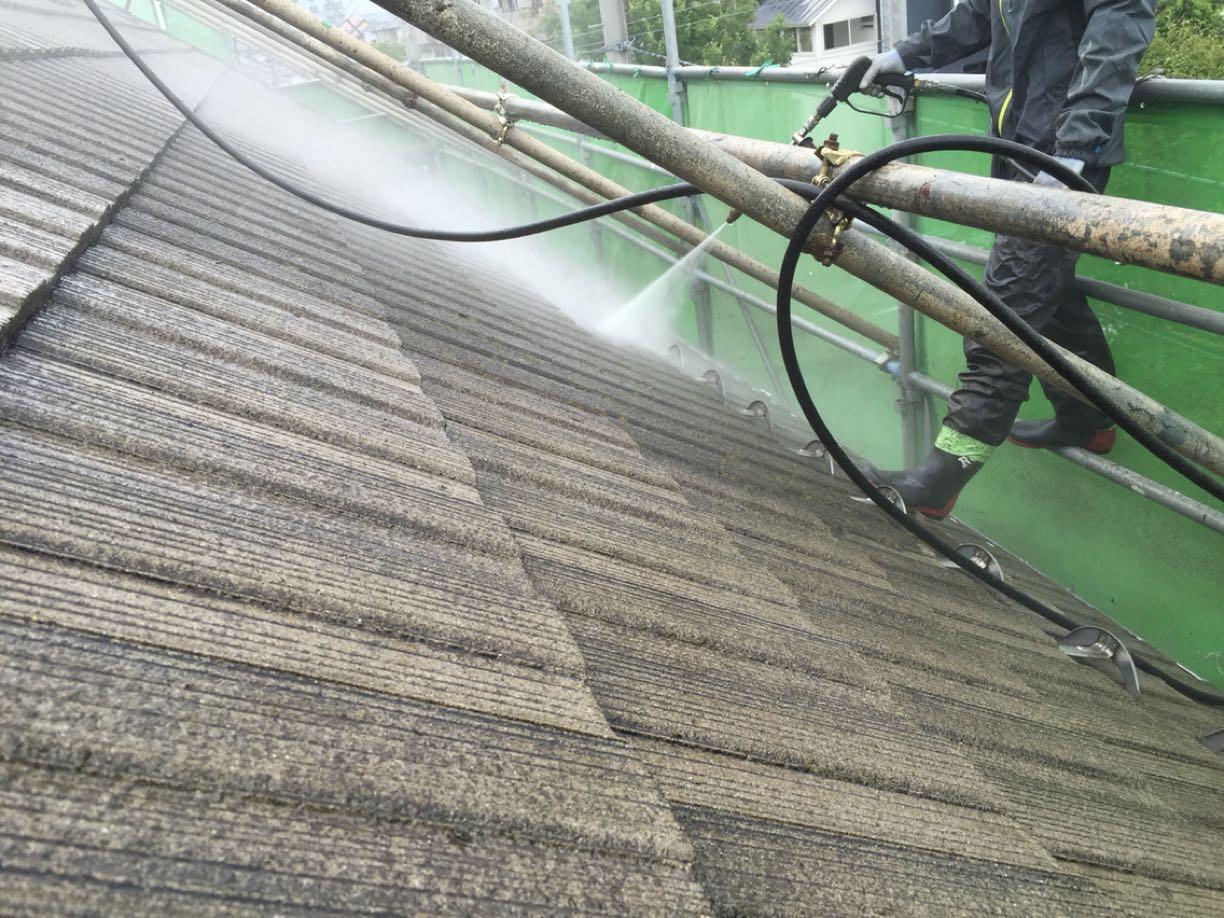 高圧洗浄を入念に行い、研磨しました。モニエル瓦は塗膜剥離の原因となるスラリー層を除去しないといけませんので慎重に行いました。