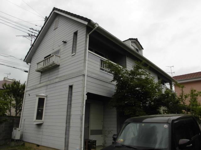 屋根の素材はモニエル瓦。外壁は窯業系サイディングです。瓦は経年劣化により、塗膜が防水機能をはたしていに状態で、カビ・苔が繁殖していました。