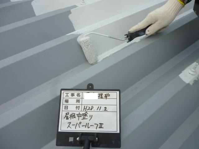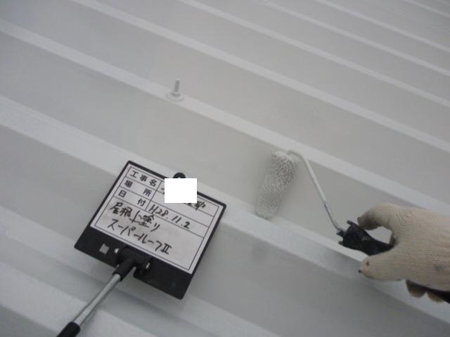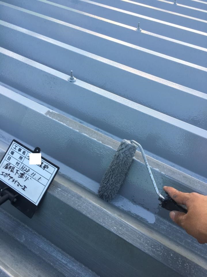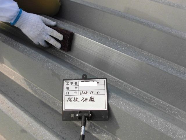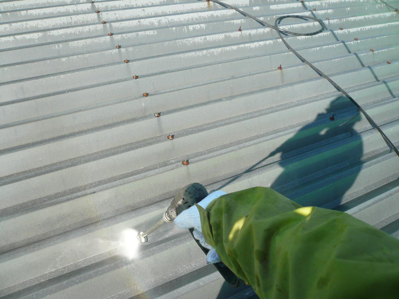折板屋根は塗膜劣化、錆が発生しておりましたので研磨を行ない、錆止めを塗布後、塗装、ボルトキャップを取付ました。