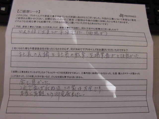 Q:他にも似たような業者があったにもかかわらず、何が決め手でプロタイムズをお選びいただいたのですか?
