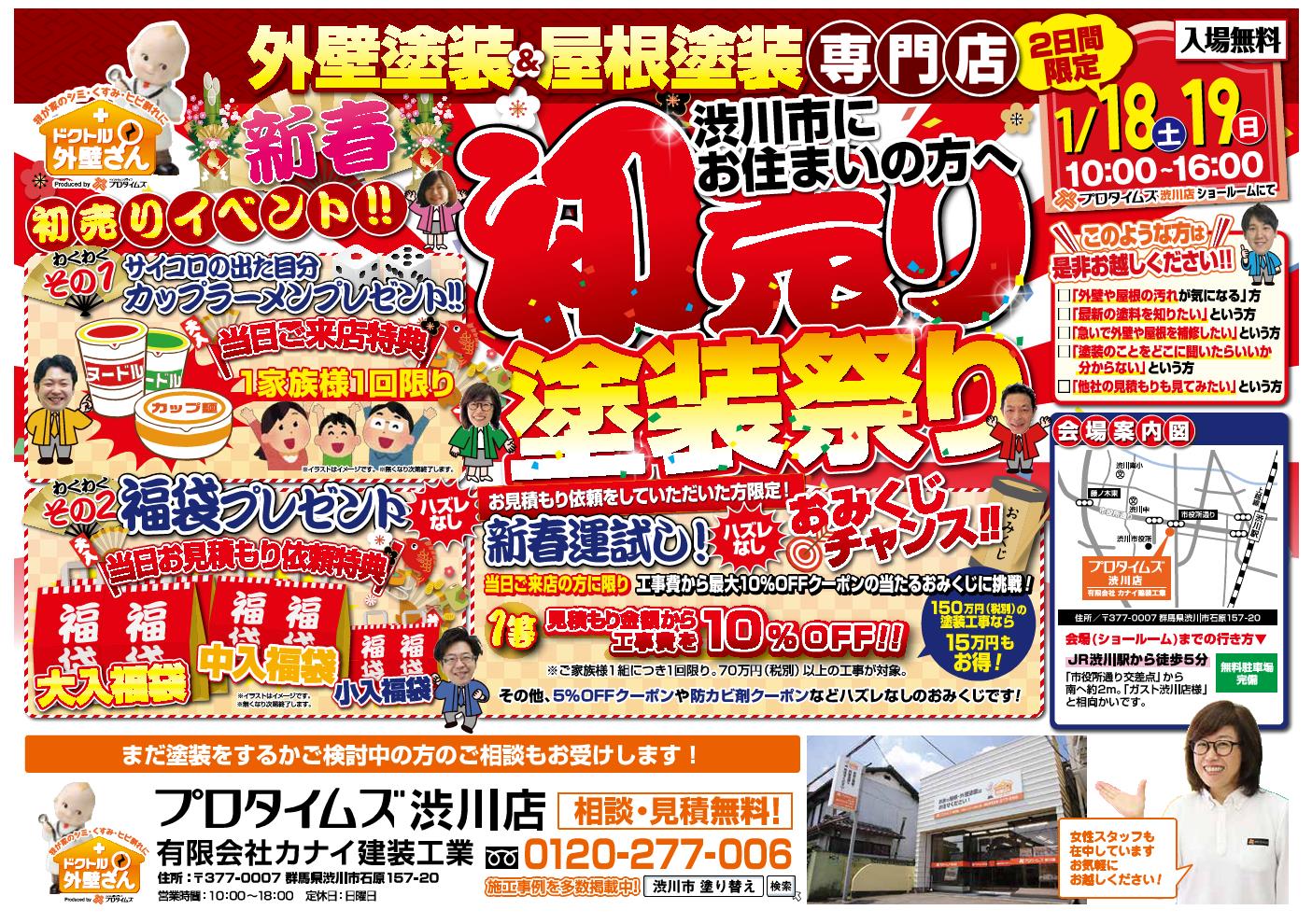 ホーム イベント 新春初売り!屋根・外壁塗装まつり! 新春初売り!屋根・外壁塗装まつり! 開催日2020/01/18(土) 時 間10:00~16:00 カテゴリリフォーム相談会 場 所プロタイムズ渋川店 イベント内容2020年。新春初売りおベントは大変お得な特典をご用意して皆様のお越しをお待ちしております。塗装のプロに相談できる2日間。ご家族、お友達お誘いの上ご来場ください。 イベント開催終了 ピックアップPICKUP 塗装品質へのこだわり 有資格者による建物診断 わかりやすく納得の見積もり