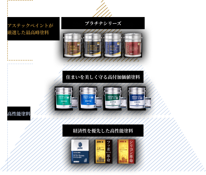 超高性能塗料”プラチナシリーズ”は、アステックペイントの塗料の中でも住まいを永く守り続けるために厳選された最高峰塗料ラインナップ。